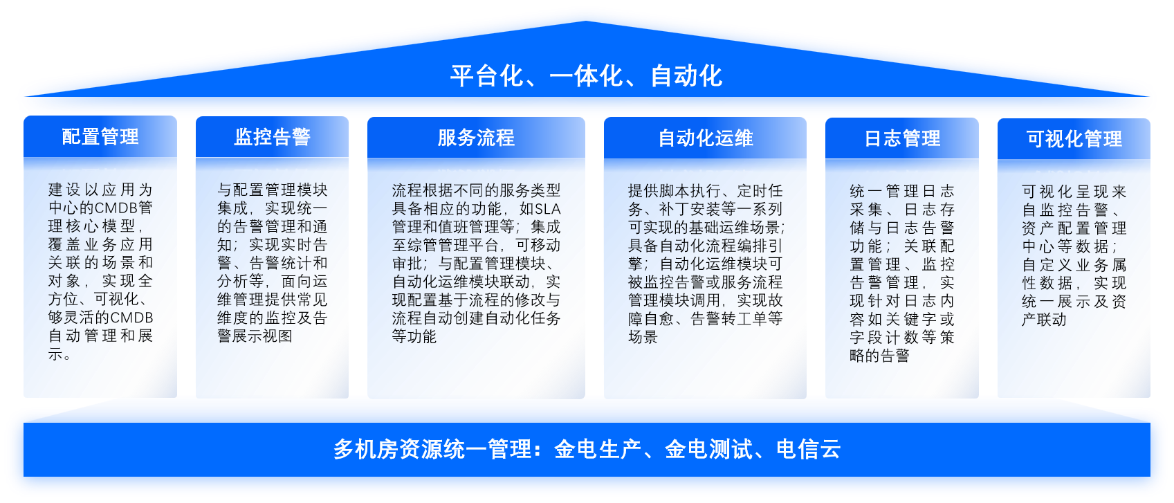 該平臺集ITSM IT服務臺、CMDB統一配置管理、監控告警、自動化運維等多個系統功能于一體,通過統一的平臺,運維團隊能更為高效地管理運維任務,減少信息孤島,提高協作效率。平臺支持自動化運維工具和運維開發框架,實現日常運維任務自動化,減少人工干預,提升運維效率與準確性。平臺具備靈活性和擴展性,支持新信創環境,且能通過API網關,無縫對接國資云、政務云、容器云及本地設備,確保功能模塊間有效協作,推動運維場景融合。