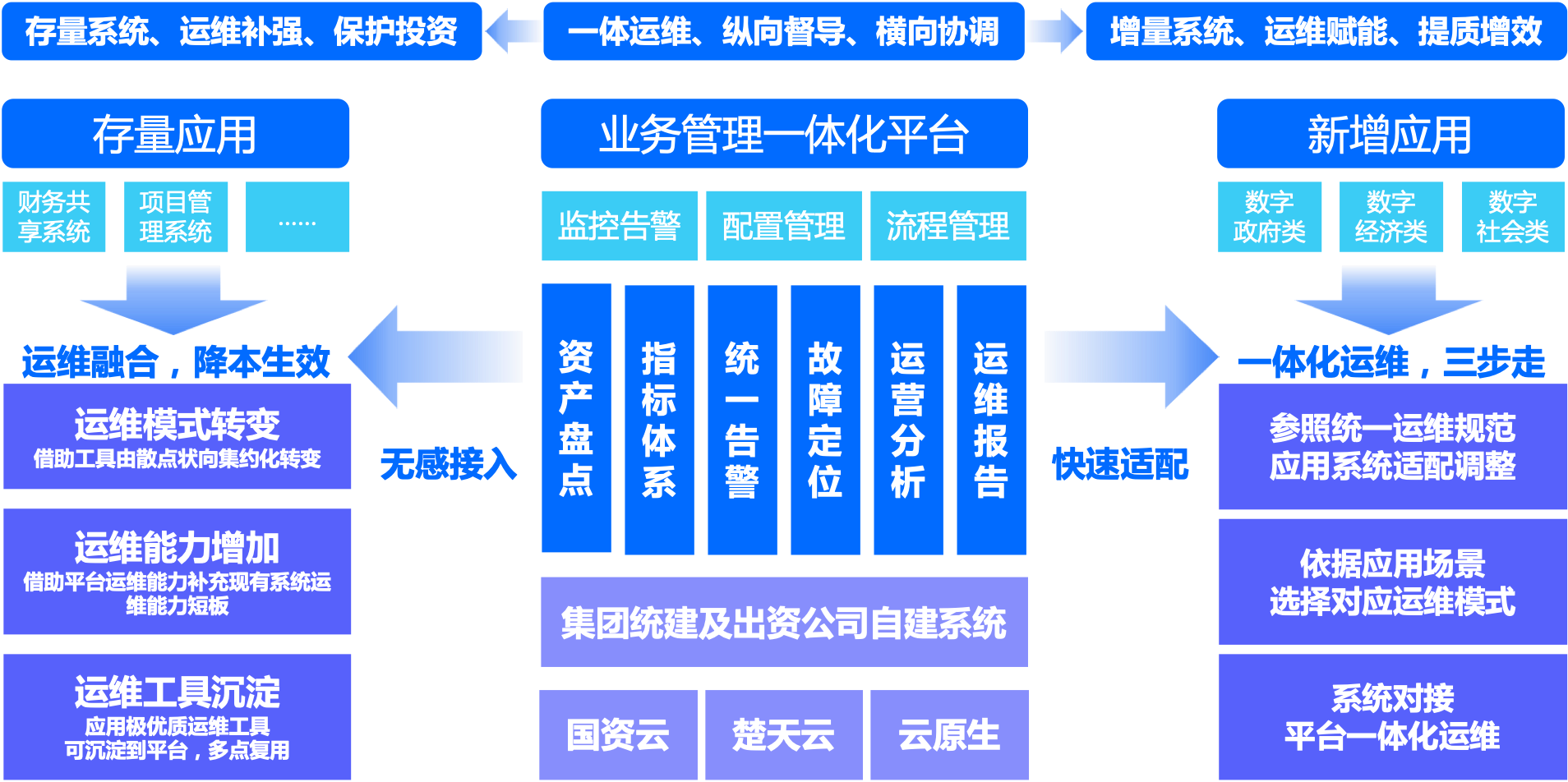 面對數字化轉型帶來的新挑戰,湖北數產集團攜手嘉為藍鯨共同打造了一體化智能運維平臺,構建“縱向監督、橫向聯動”的一體化運維監管體系。對于現有存量應用,采用“無感接入、運維融合”的策略;對于新增系統,采用“三步走”方法,快速提升應用系統的運維能力,實現運維工作質的飛躍。