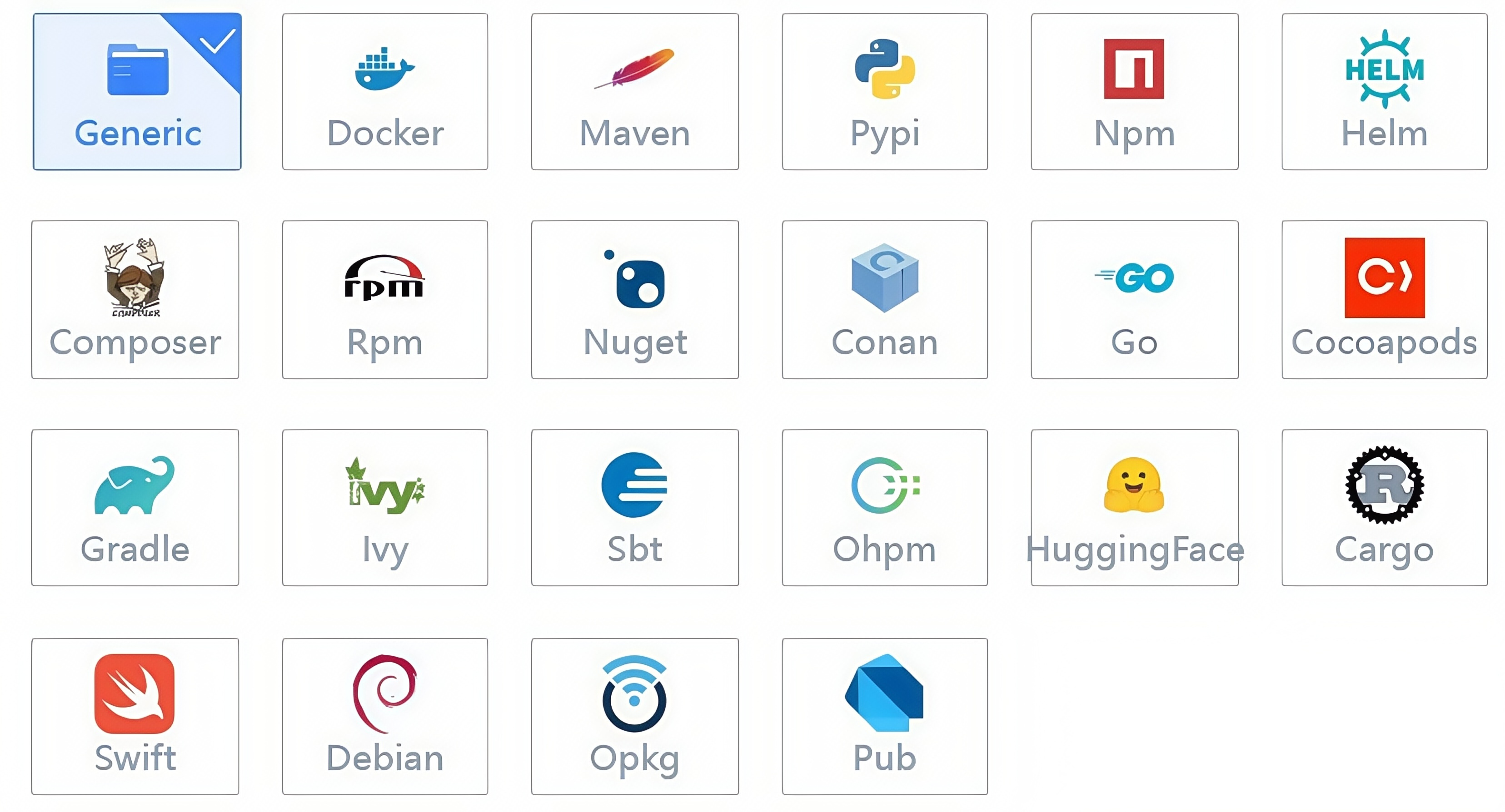 開發團隊的技術棧日益多元:Java開發需要管理JAR包,移動應用團隊要處理APK文件,AI團隊則涉及大模型訓練文件等特殊資產。JFrog支持Maven、Docker等十多種主流制品類型,能覆蓋大部分傳統開發場景,但面對鴻蒙OHPM包、HuggingFace大模型文件等新興或小眾類型時,可能需要額外配置甚至無法支持。