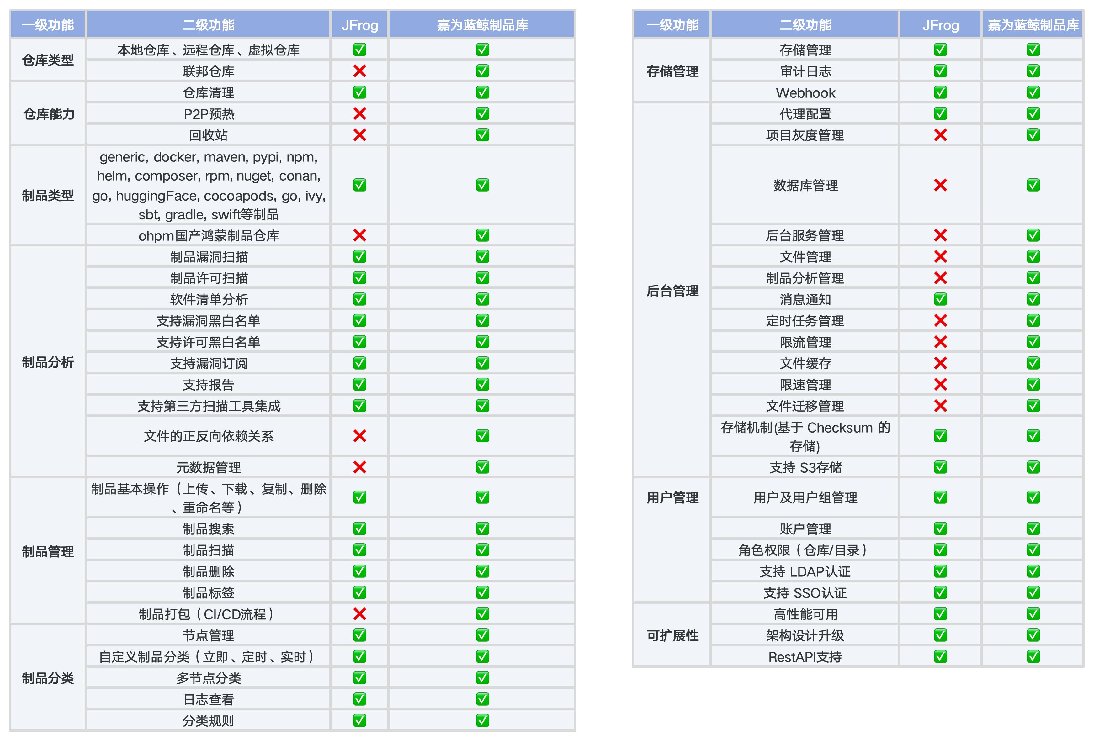 嘉為藍鯨制品庫在功能設計上全面考量企業制品管理的各類場景,功能覆蓋與創新方面表現卓越,幾乎滿足JFrog所有功能需求。甚至在基礎功能上,嘉為藍鯨制品庫后臺管理功能遠遠超于JFrog的后臺管理能力,以下是兩者間的對比清單: