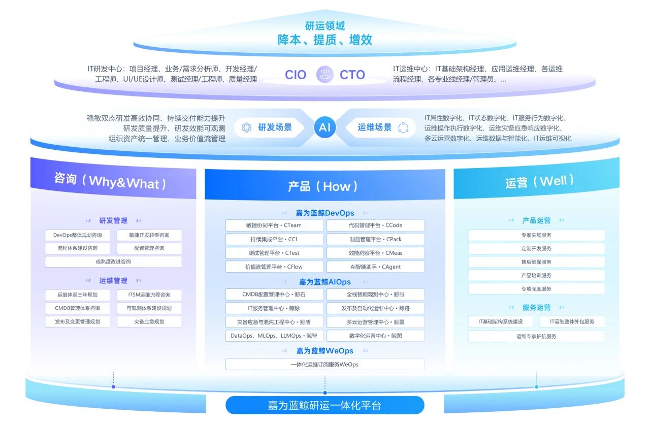 嘉為藍鯨,作為數(shù)字研運解決方案的引領者,結合業(yè)內(nèi)先進的騰訊藍鯨PaaS技術架構、融合嘉為科技20余年研運經(jīng)驗打造的一體化平臺,包含:一站式研發(fā)效能解決方案DevOps,一體化、平臺化、智能化運維解決方案AIOps,一體化智能運維訂閱服務WeOps。為客戶提供IT研發(fā)、運維、運營全領域的產(chǎn)品與解決方案,以科技之力助企業(yè)運營更智能!